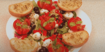 Kilka gatunków salaty plus mozzarella,pomidorki,oliwki i grzanki z ciabatty i mamy smakowitą sałatkę.
